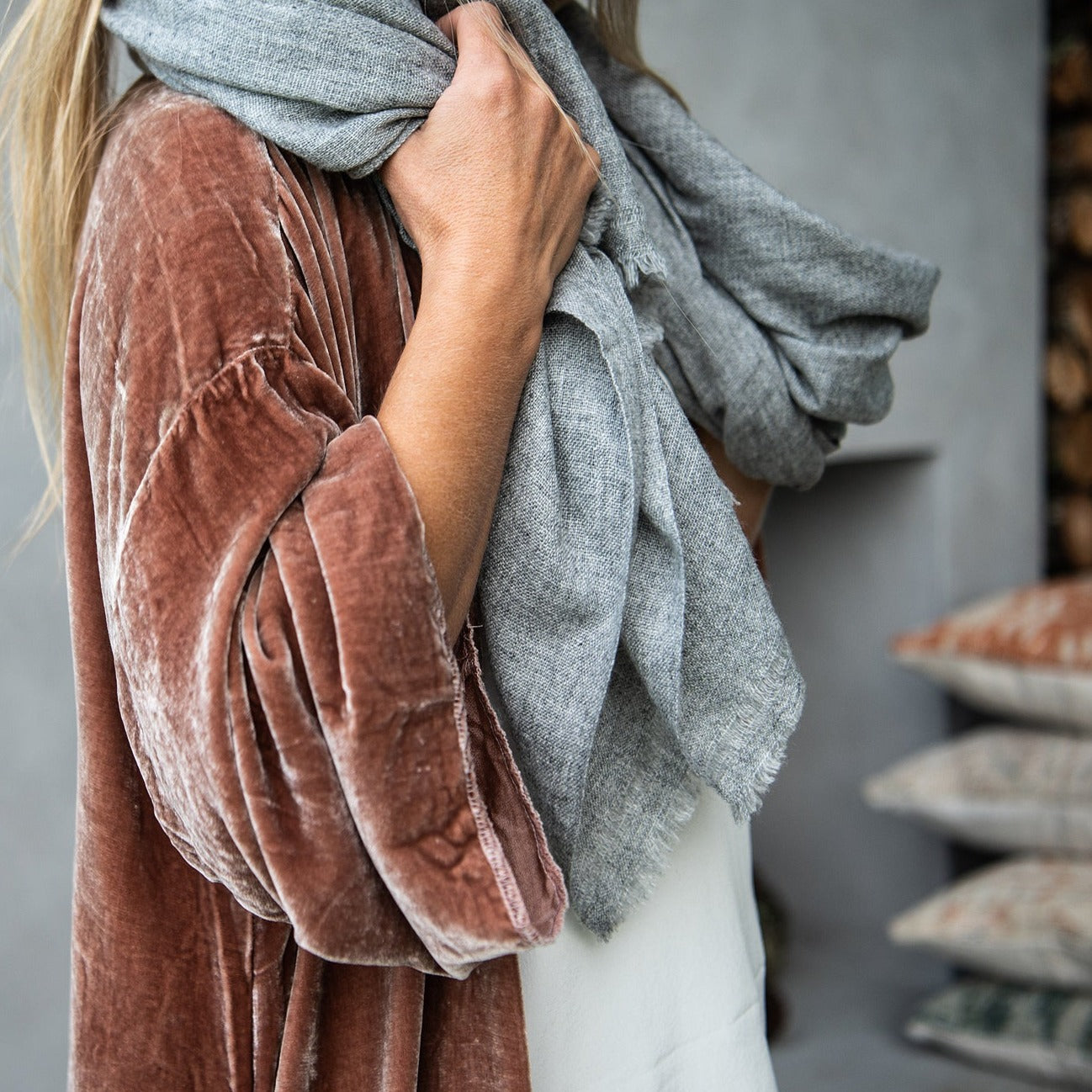 A soft textural fine weave crafted by our artisans in Nepal on traditional looms.