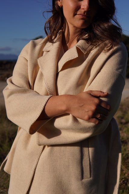 Crafted in 100% Pure Wool the Stitch Coat or jacket the perfect light layers in the softest double faced wool fabric with a lovely blanket stitch detail to the edges. Detachable fabric belt. Comfy pockets as shown. Sits just below the hip on most.