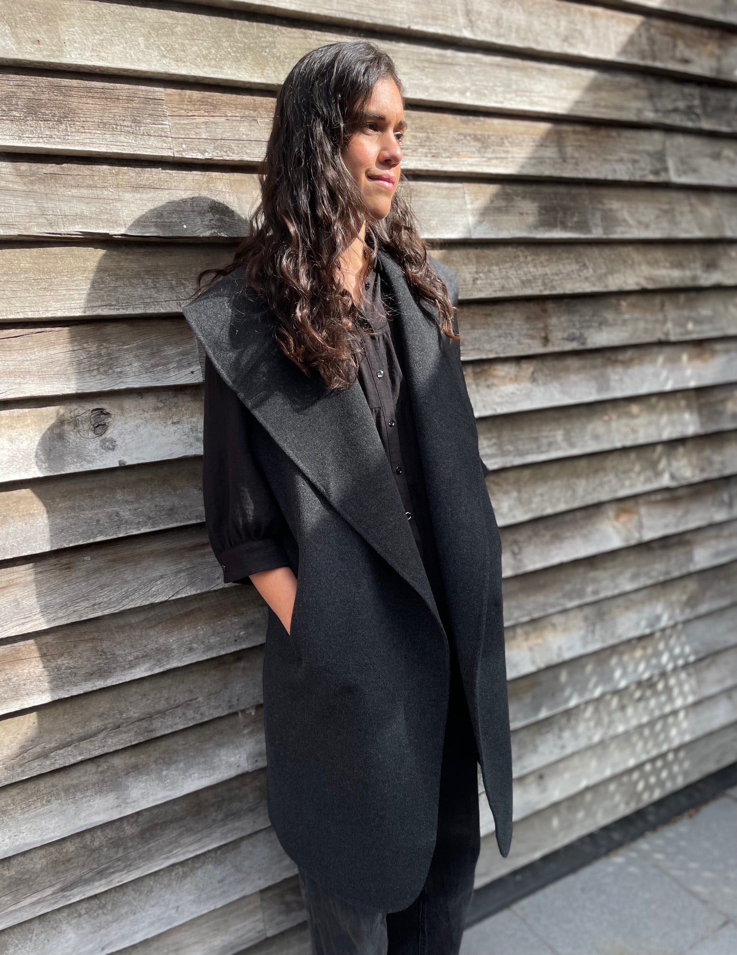 This coat will truly take you anywhere - everyday or evening wear without the restriction of sleeves - allowing you movement and ease no matter what - whilst offering a cosy soft pure wool shell to wrap your core. You'll find 2 subtle pockets to keep your hands tucked away and wide cloak like collar to keep your neck toasty. Sits just below the knee.