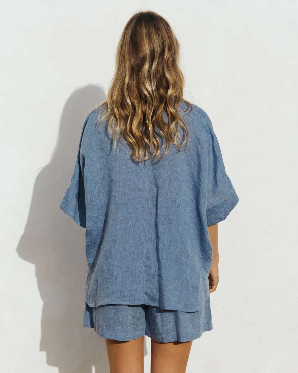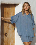 Your Summer denim in pure linen. This lightweight pure linen shirt is a new go to for beaching and holiday living. An oversized fit to suit most. Crafted in a marle linen reminiscent of soft light chambray but better! Casual luxe at its best.