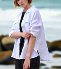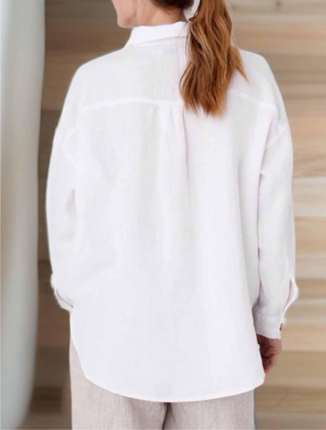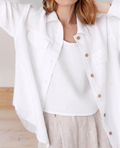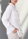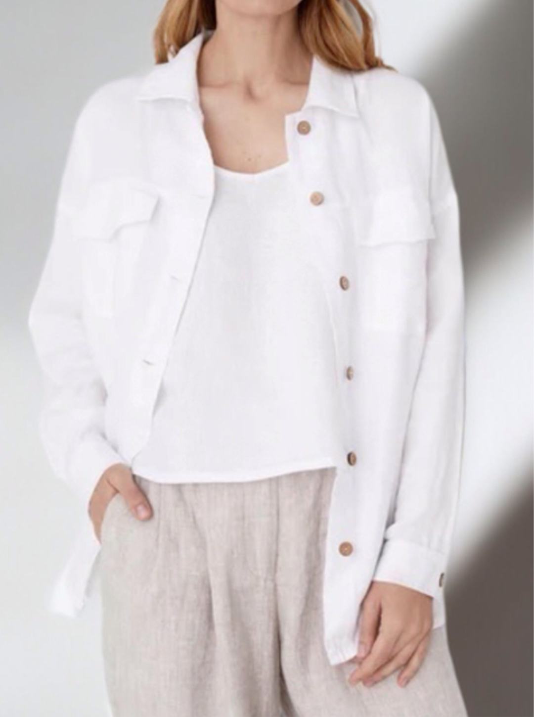 Welcome to our Linen Wardrobe Collection - Crafted from a medium weight linen - our Shirt Jacket is perfectly designed to be worn buttoned through or open as a light jacket. 2 front pocket details. A go to weekender to pop over just about anything and a travel essential. Rounded hemline to compliment the loose fit and cuffed long sleeve to button or roll as you please.